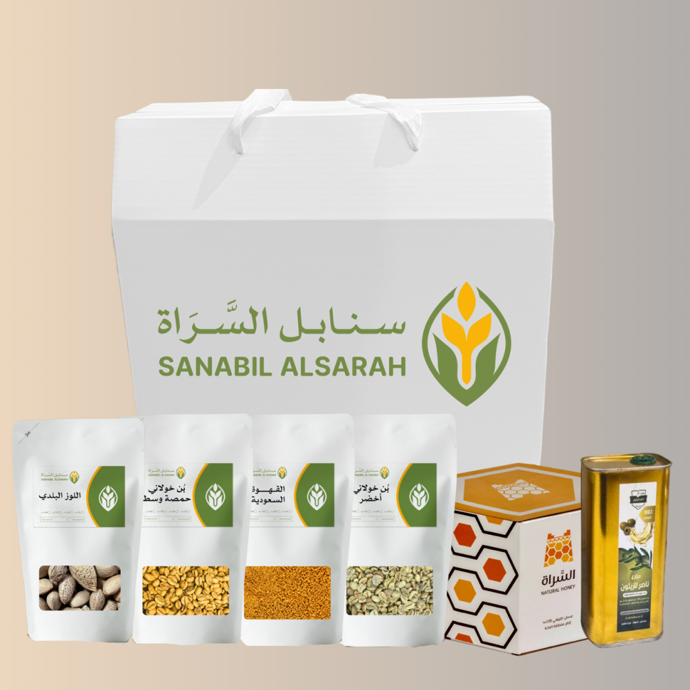 تتكون هذه الحقيبة من المنتجات التالية :1 : البن الأخضر الصافي ( بن خولاني يمني ) 250 جرام2 : القهوة السعودية ( محضرة من البن الخولاني اليمني والهيل الفاخر والزعفران ومحسنات القهوة ) 250 جرام3 : بُن خولاني يمني حمصة وسط 250 جرام4 : عسل السراة البلدي ( سدر ) 500 جرام5 : زيت الزيتون البلدي ( إنتاج منطقة الباحة ) عصرة أولى بكر 1000 مل6 : لوز الباحة البلدي 250 جرامللطلبات الأكثر من 30 حقيبة يمكنكم طلب طباعة الشعار الخاص بكم على الحقيبة مجاناً ( لون واحد )إذا كان الشعار لونين وأكثر يتم إضافة مبلغ 100 ريال عن كل لون إضافي ؛ تواصلوا معنا عبر الواتس آب للمتجر 0550685870
